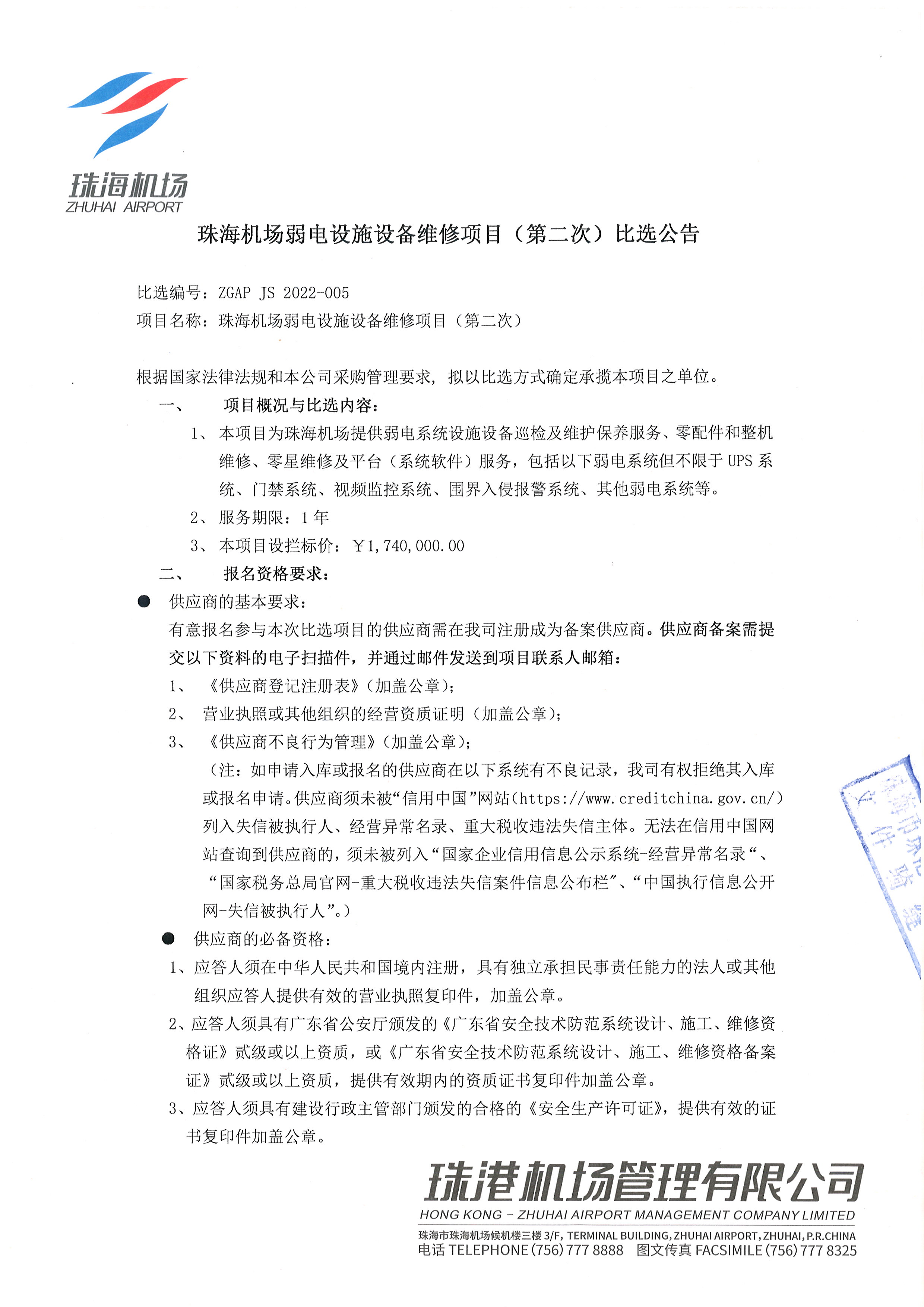 珠海机场弱电设施设备维修项目(第二次)比选公告